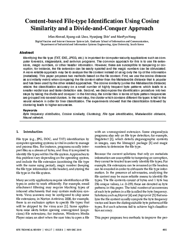 Pdf Content Based File Type Identification Using Cosine Similarity And A Divide And Conquer Approach Irfan Ahmed Academia Edu