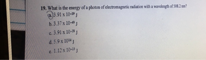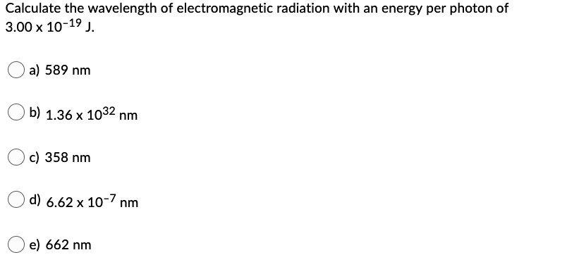 Solved Calculate The Wavelength Of Electromagnetic Radiation With An Energy Per Photon Of 3 00 X 10 19 589 Nm B 1 36 X 1032 Nm 358 Nm 6 62 X 10 7 Nm 662 Nm